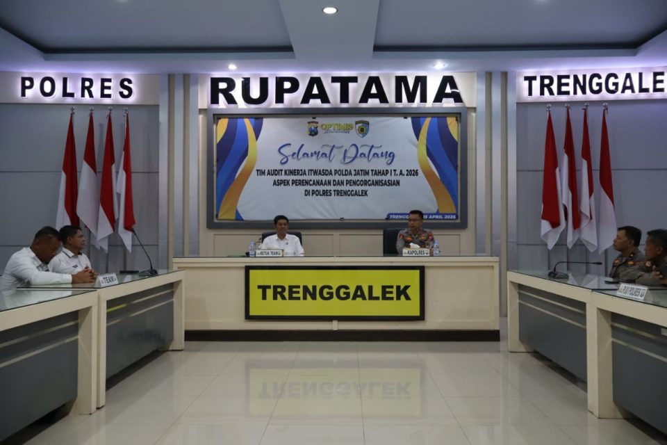 Polres Trenggalek – Tim auditor Itwasda Polda Jatim berkunjung ke Mapolres Trenggalek. Kehadiran tim auditor merupakan agenda rutin dalam rangka audit dan pengawasan kinerja di masing-masing satuan di lingkungan Polda Jatim. Tak terkecuali jajaran Polres Trenggalek. Rabu, (15/4).