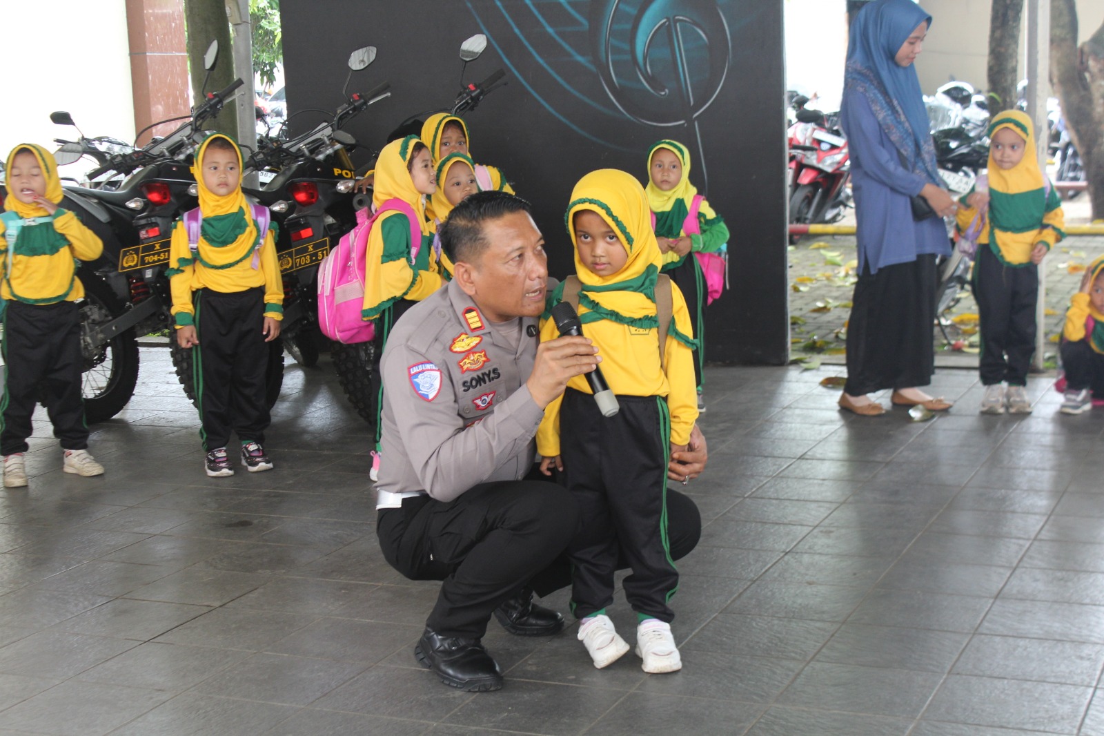 Bukan itu saja, mereka juga dikenalkan dengan berbagai seragam dan peralatan hingga kendaraan dinas yang kerap digunakan oleh kepolisian saat menjalankan tugas. Rasa penasaran yang tinggi ditambah dengan suasana yang menyenangkan membuat anak-anak menjadi semakin antusias.