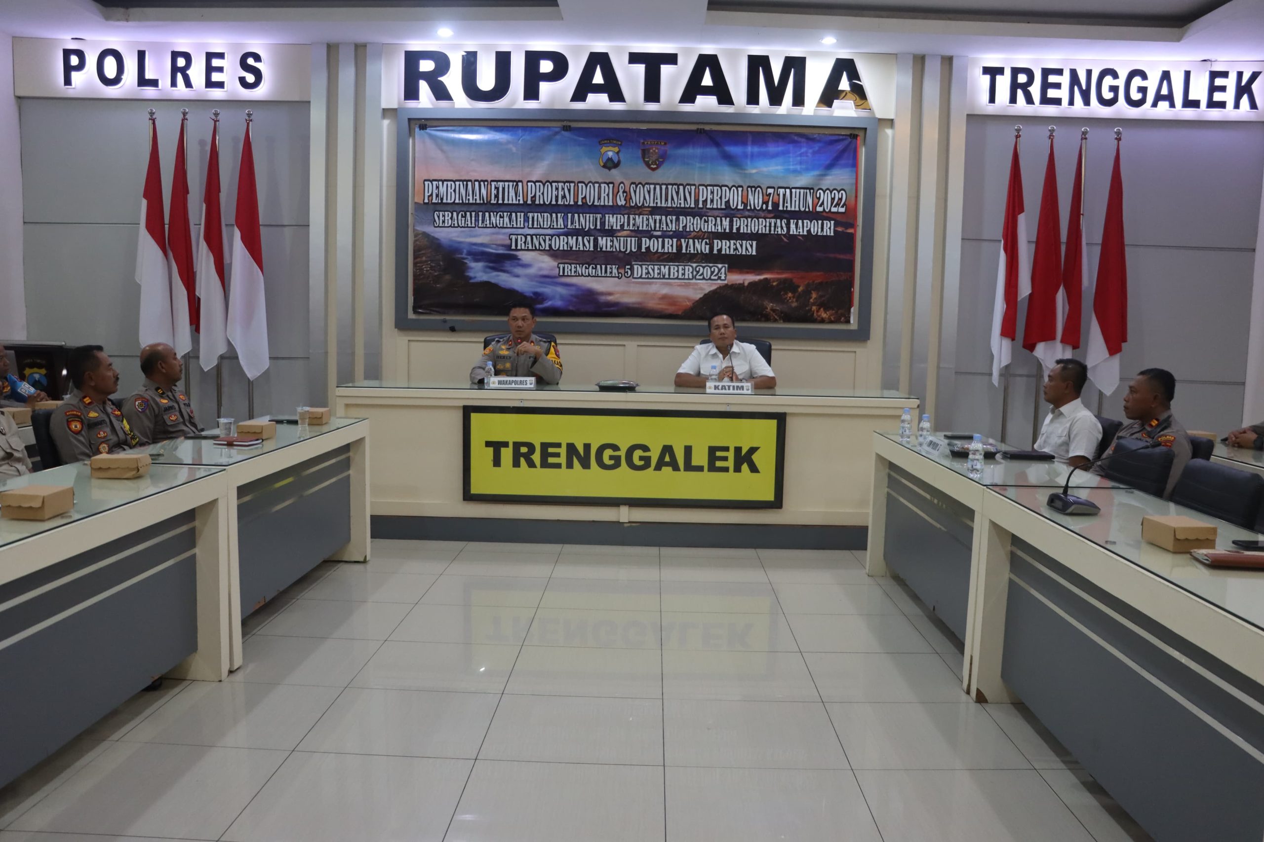 Kapolres Trenggalek AKBP Indra Ranu Dikarta, S.I.K., M.Si. melalui Wakapolres Kompol Herlinarto S.E., M.M. menuturkan, pembinaan etika Polri ini merupakan tindak lanjut dari implementasi program prioritas Kapolri yakni transformasi menuju Polri yang presisi.
