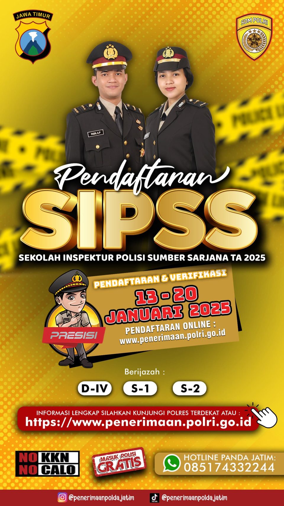 Polres Trenggalek – Kepolisian Negara Republik Indonesia membuka kesempatan bagi para pemuda-pemudi Indonesia untuk bergabung dan mengabdikan diri kepada bangsa dan negara melalui Polri. Kepolisian telah membuka penerimaan Siswa Sekolah Inspektur Polisi Sumber Sarjana (SIPSS) Tahun Anggaran 2025.