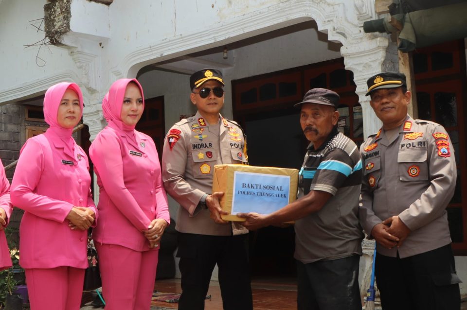 Didampingi oleh sejumlah pejabat utama dan Bhayangkari, orang nomor satu di jajaran Polres Trenggalek ini menyerahkan bantuan sosial berupa paket sembako lengkap kepada warga.