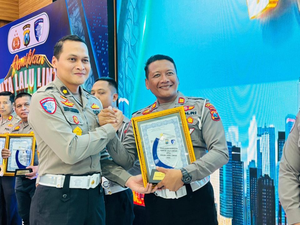 Penghargaan tersebut diserahkan langsung oleh Direktur Lalu Lintas Polda Jatim Kombes Pol Iwan Saktiadi, S.I.K., M.H., M.Si. bersamaan digelarnya duta lalu lintas tahun 2025 dalam rangka memperingati Hari Lalu Lintas Bhayangkara di gedung Mahameru Polda Jatim. Kamis, (23/10).