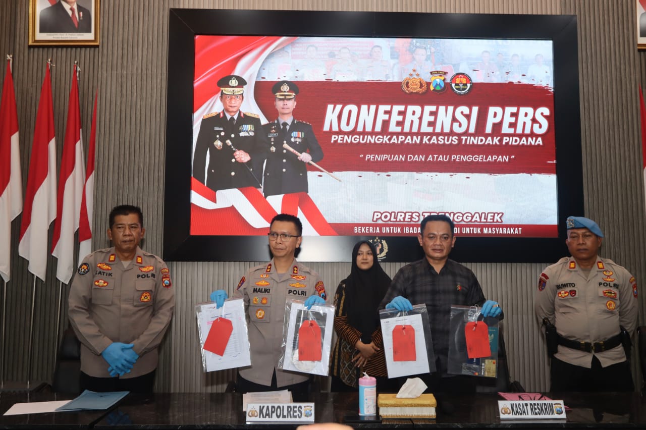 Polres Trenggalek – Jalan panjang pengungkapan kasus penipuan dan penggelapan modus lelang arisan selesai sudah. Jajaran Satreskrim Polres Trenggalek berhasil mengamankan satu tersangka NK, warga Trenggalek yang sempat kabur ke luar pulau, bahkan ke luar negeri.
