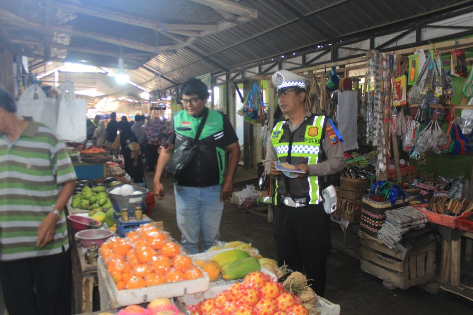 Tak berhenti disitu, sembari blusukan ke dalam pasar dan menyapa para pedagang dan pengunjung, petugas juga nampak membagikan pamflet yang berisi tentang serba serbi Operasi Keselamatan Semeru 2026 serta tips berkendara yang aman dan berkeselamatan.